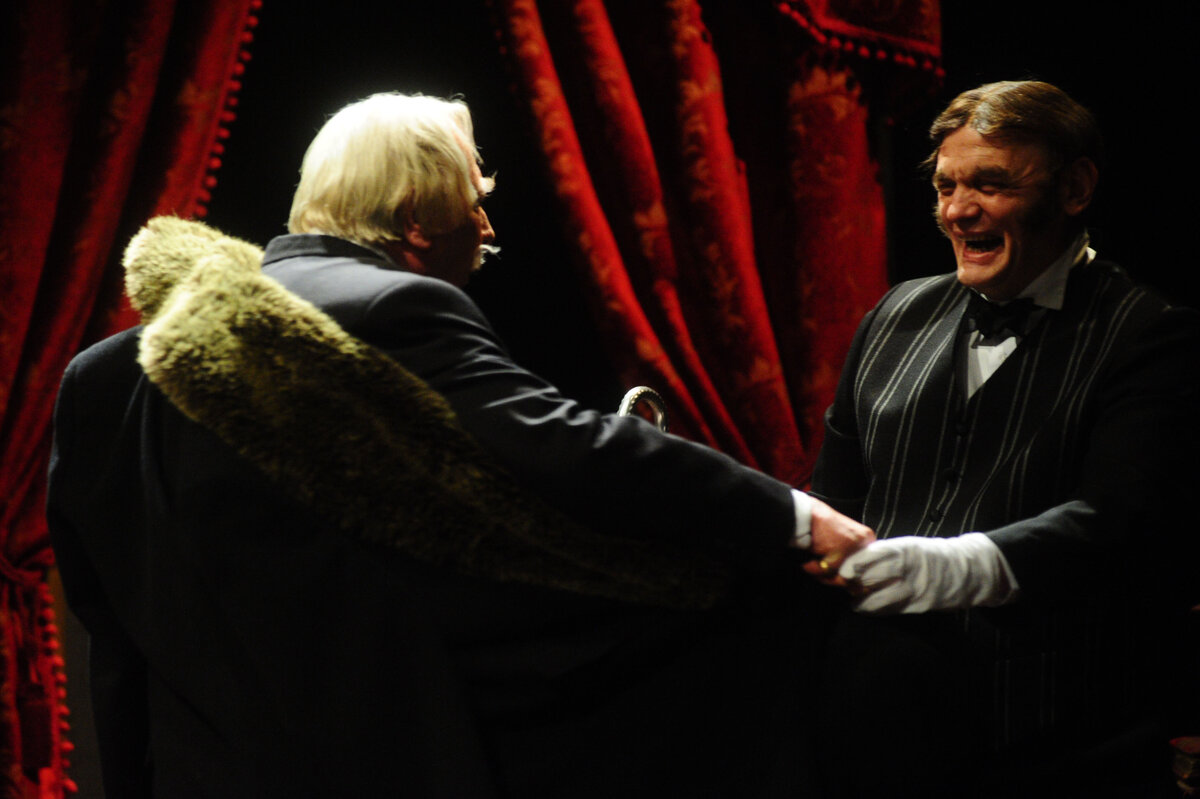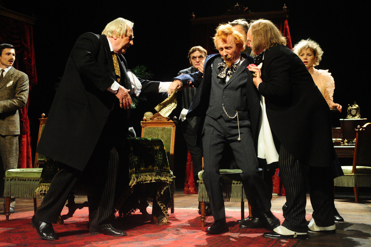 GRUBE RYBY gładko wpisują się w formułę teatru dla każdego. W zapomnianej, niegranej niemal sztuczce Bałuckiego widzi szansę na powrót do teatru w najbardziej tradycyjnym stylu. Z kostiumami z epoki podrasowanymi przez współczesny smak i poczucie humoru oraz bogatą charakteryzacją, która sprawia, że na scenie trudno rozpoznać popularnych aktorów. Im właśnie daje szansę ukrycia się za rysowanymi grubą kreską postaciami po to, by bawić się konwencją komediowej ramoty, punktować najzabawniejsze repliki, wreszcie naprawdę ze sobą dialogować. Wystarczy spojrzeć, jak role Wistowskiego i Pagatowicza prowadzą Sławomir Orzechowski i Artur Barciś. Jak noszą paradne kostiumy, jak ogrywają peruki i karykaturalne bokobrody. Jak wreszcie swe postaci definiują samym ruchem, bez słów. Majstersztyk nienachalnego komizmu.