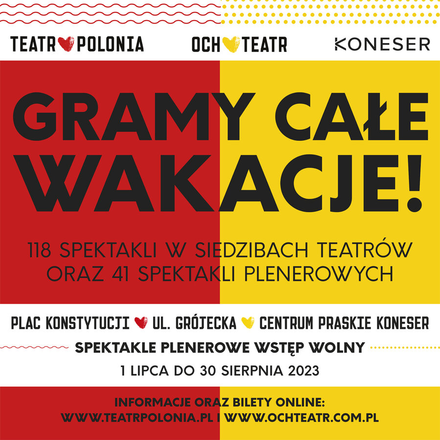 Letnie wakacje 2023 roku w Warszawie obfitować będą w atrakcyjne propozycje teatralne, dzięki inicjatywie Teatru POLONIA i OCH-Teatru, prowadzonych przez Fundację Krystyny Jandy na Rzecz Kultury. Oba teatry już od 16 lat kontynuują tradycję organizowania spektakli przez całe wakacje. Tegoroczne wakacyjne święto teatru trwająca od 1 lipca do końca sierpnia, zaprasza widzów na 39 tytuły, które będą wystawiane łącznie aż 159 razy. W lecie aż 118 spektakli zostanie zagranych w siedzibach teatrów, a 41 w plenerach: na Placu Konstytucji, przy ul. Grójeckiej 65 oraz w Centrum Praskim Koneser.