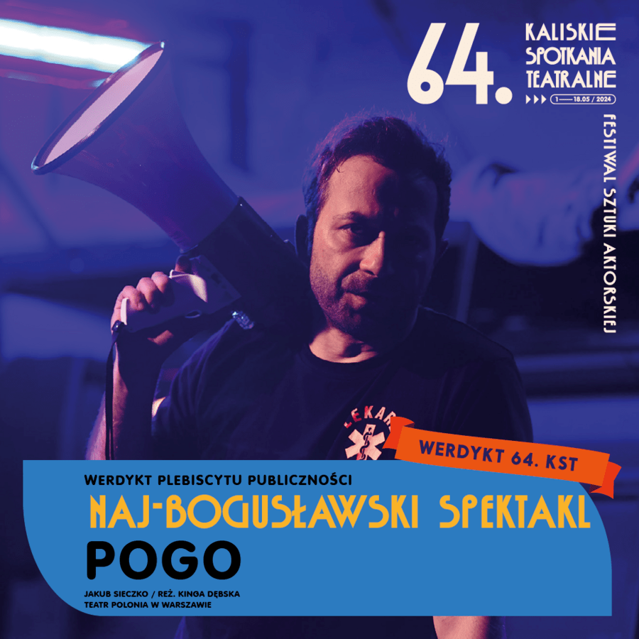 Z wielką radością informujemy, że spektakl POGO w reżyserii Kingi Dębskiej Teatr Polonia w Warszawie, zdobył prestiżową Nagrodę Publiczności dla Naj-Bogusławskiego Spektaklu podczas 64. Kaliskich Spotkań Teatralnych – Festiwalu Sztuki Aktorskiej! Spektakl zdobył serca Widzów, uzyskując 112 oddanych ważnych głosów i ocenę 9,6. Dziękujemy Wspaniałej Publiczności!