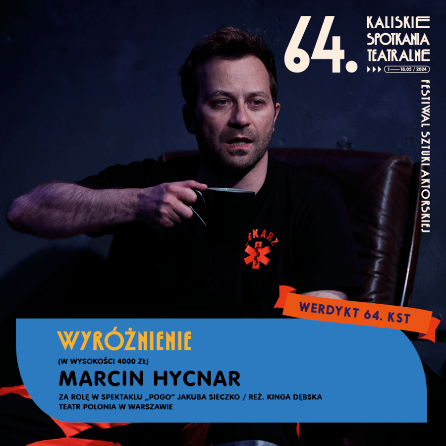 Jury 64. Kaliskich Spotkań Teatralnych – Festiwalu Sztuki Aktorskiej przyznało wyróżnienie Marcinowi Hycnarowi za rolę w spektaklu POGO w reżyserii Kingi Dębskiej z Teatru Polonia w Warszawie.