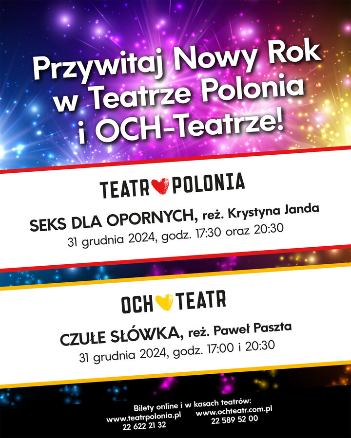 Przywitajcie Nowy Rok z humorem i doskonałą zabawą w Teatrze Polonia! W sylwestrowy wieczór, 31 grudnia, aż dwukrotnie zagramy nasz hitowy spektakl – „Seks dla opornych” w reż. Krystyny Jandy.
